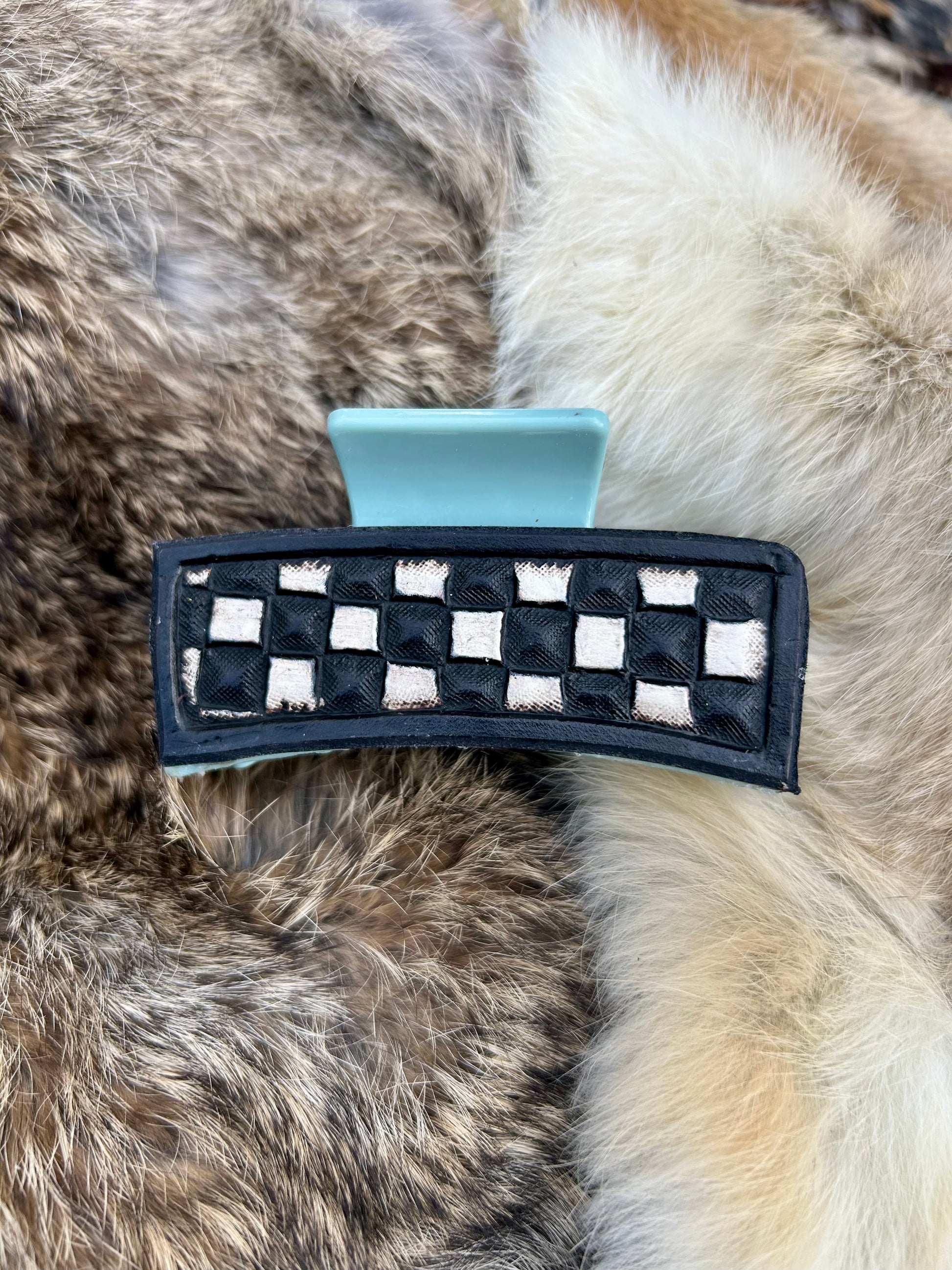 Add a touch of western charm to your everyday look with the Cowgirl Cool Clawclip. This 3” baby blue claw clip features a playful checker print and is accented with beautifully tooled leather for a unique, standout style. Perfect for holding your hair effortlessly while adding a fun, cowgirl-inspired twist.