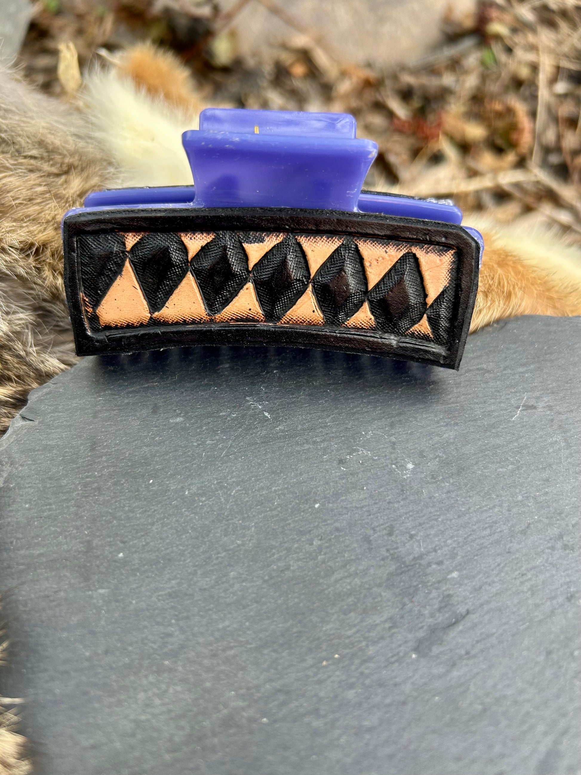 Add a pop of playful charm to your look with the Dusty Diamond Claw Clip. This 3” baby purple clip features a striking black and tan diamond print on soft tooled leather, blending fun patterns with sturdy hold. Perfect for keeping your hair stylishly in place while adding a unique twist to your everyday style.